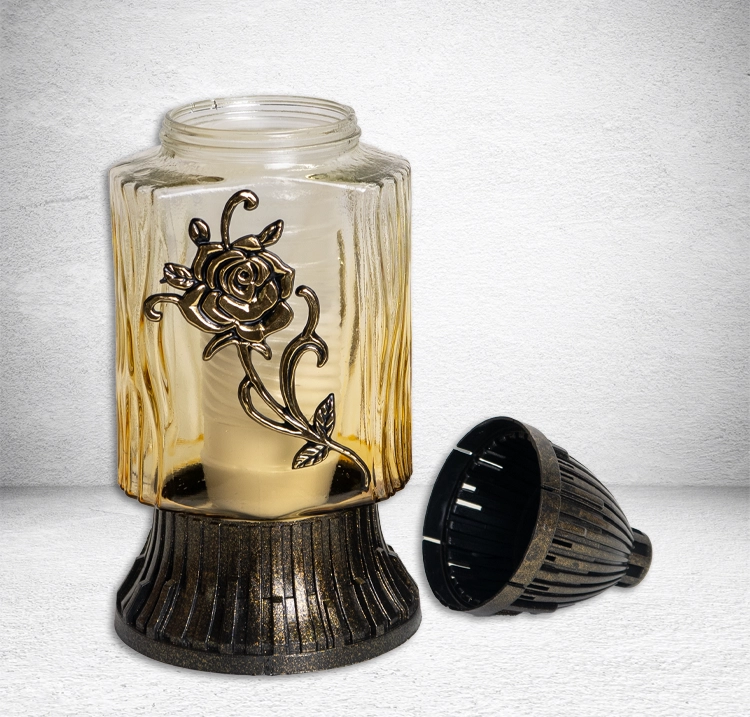 —Лампада стеклянная Роза 3 Znicz (размер 26х11, корпус прямоугольный, колба желтое стекло, пластик бронза, Роза золото, в упаковке 8 шт.) арт:2482