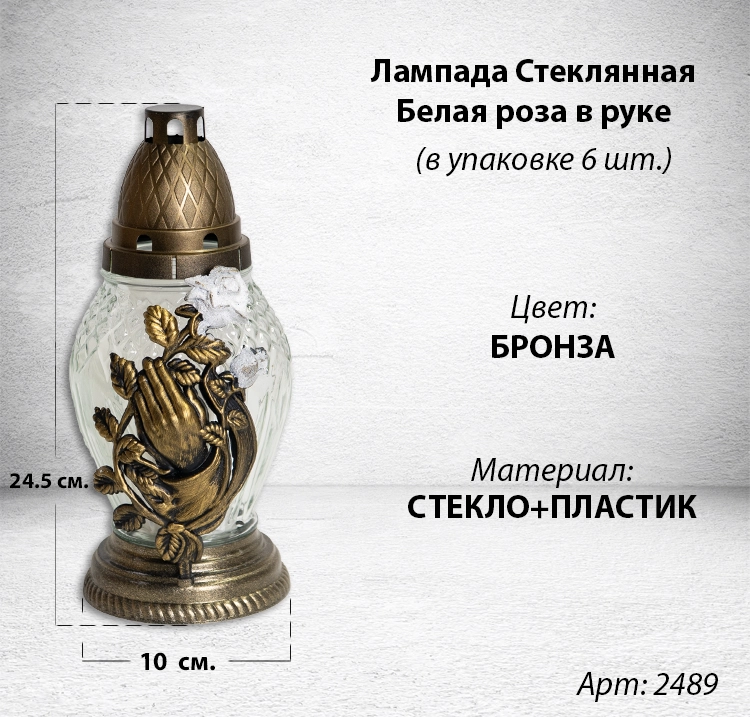 —Лампада стеклянная Белая роза в руке (размер 24,5х10, корпус Овал, колба прозрачное стекло, пластик бронза, Белая Роза в руке бронза, в упаковке 6 шт.) арт:2489